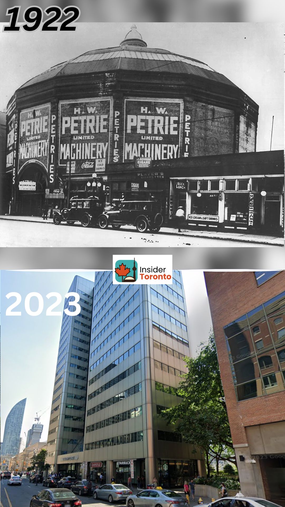 The Cyclorama building was a unique, 16-sided, circular exhibition hall built in 1887 at 131 Front St W (near University Ave), designed to showcase 360-degree, panoramic paintings, an 1800s form of virtual reality. Despite its status as a popular attraction and later listing on the city's inventory of historic treasures, the structure was demolished in 1976 to make way for the Citigroup Place office tower.