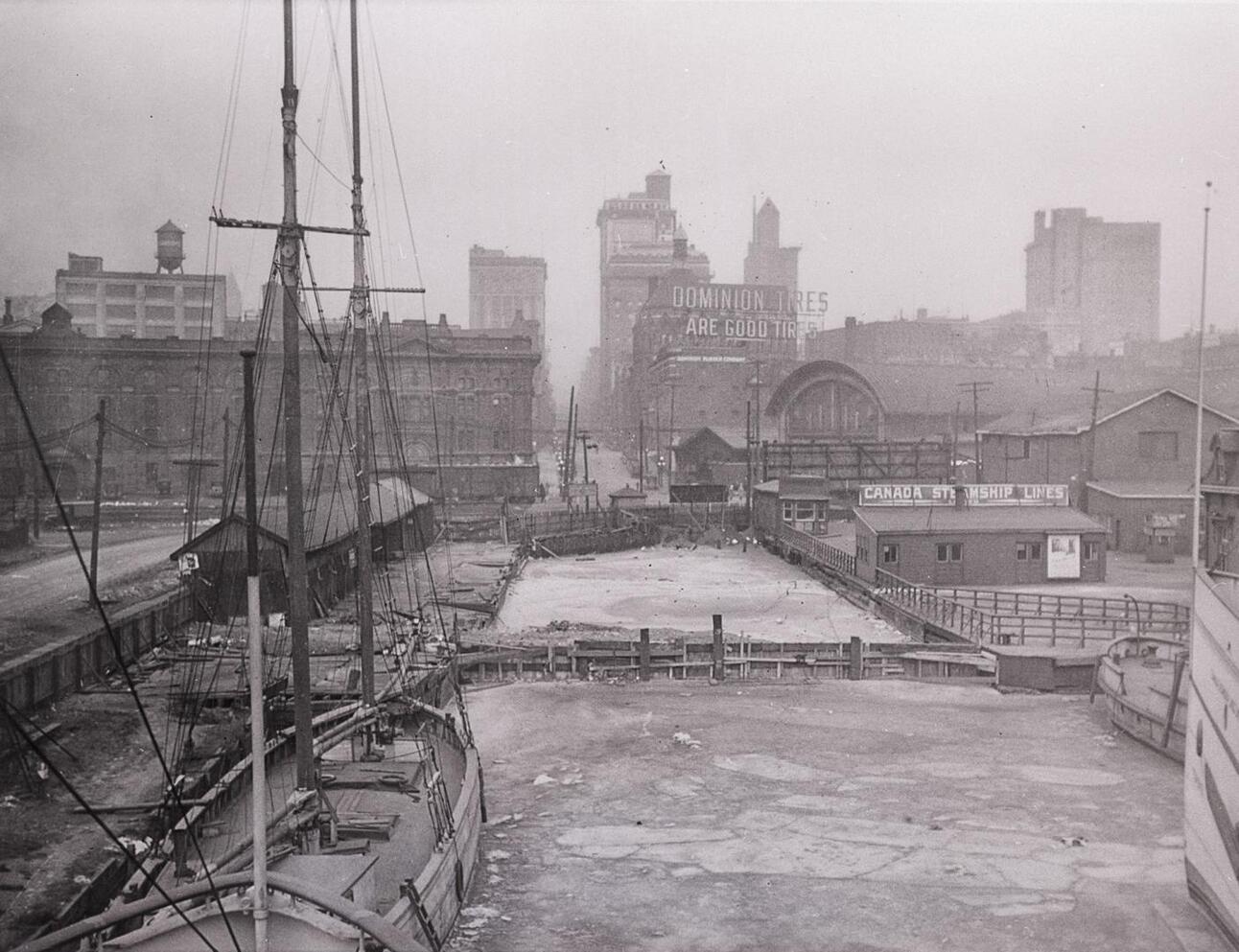 Yonge Street Wharf looking North from the foot of The Esplanade. 1920s.