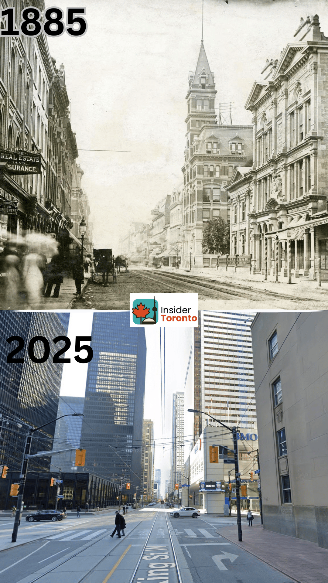 Then (1885): This historic photograph captures King Street West, looking west from east of Bay Street, with storefronts and horse-drawn carriages lining the street. On the right stands the Canada Life Assurance Company offices, their stone façade richly detailed in the Italianate style. Dominating the view in the distance is the Mail Building, completed in the 1870s in the Second Empire style, recognizable by its mansard roof, ornate dormers, and soaring spire.